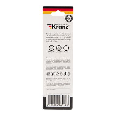 Пилка для электролобзика KRANZ с улучшенной заточкой зубьев предназначена для работ по металлу. Она отлично подходит для всех марок электролобзиков с креплением для Т-образного хвостовика и надежно фиксируется в патроне.