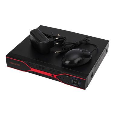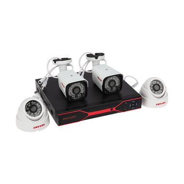 Готовый к установке комплект видеонаблюдения REXANT, состоящий из 2 всепогодных цилиндрических AHD видеокамер, двух купольных AHD видеокамер внутренней установки и 4-канального AHD-видеорегистратора.