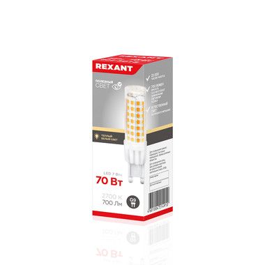 Светодиодная лампа REXANT капсульного типа JD-CORN G9 мощностью 7 Вт и с теплым белым свечением в 2700 K отлично подходит для освещения комнат, коридоров, бытовых помещений и промышленных объектов.